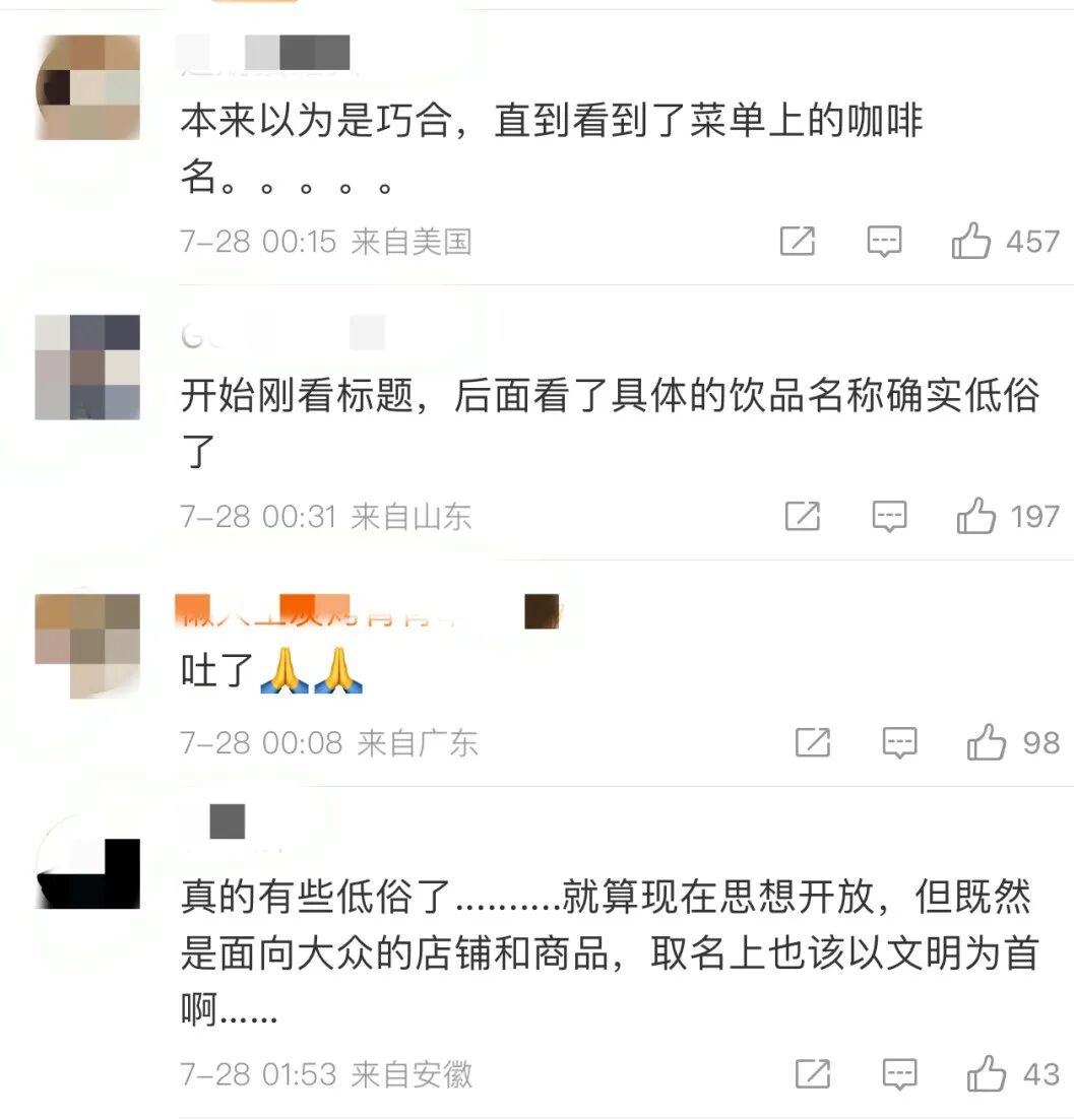 对于该咖啡店网友纷纷表示:光看店名还以为是巧合但饮品名字的确低俗、没下线!