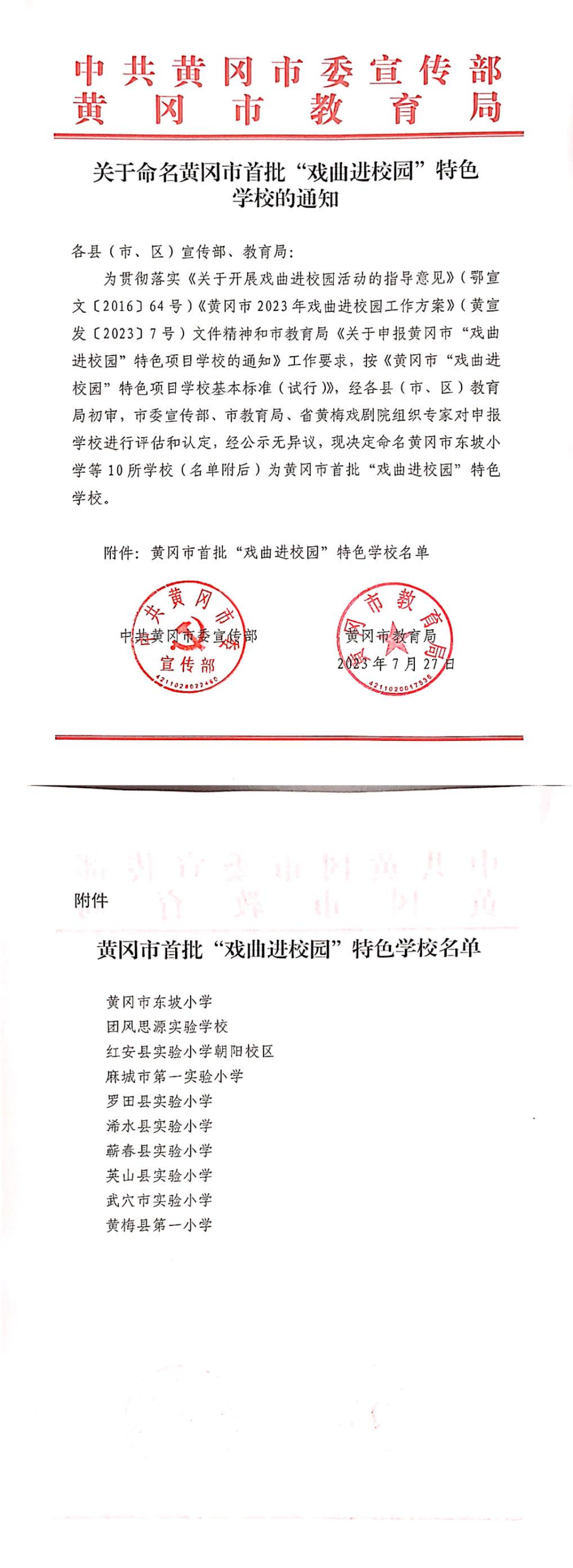 经各县(市、区)教育局初审,市委宣传部、市教育局、省黄梅戏剧院组织专家对申报学校进行评估和认定,经公示无异议,黄冈市东坡小学等10所学校(名单附后)获批黄冈市首批“戏曲进校园”特色学校。