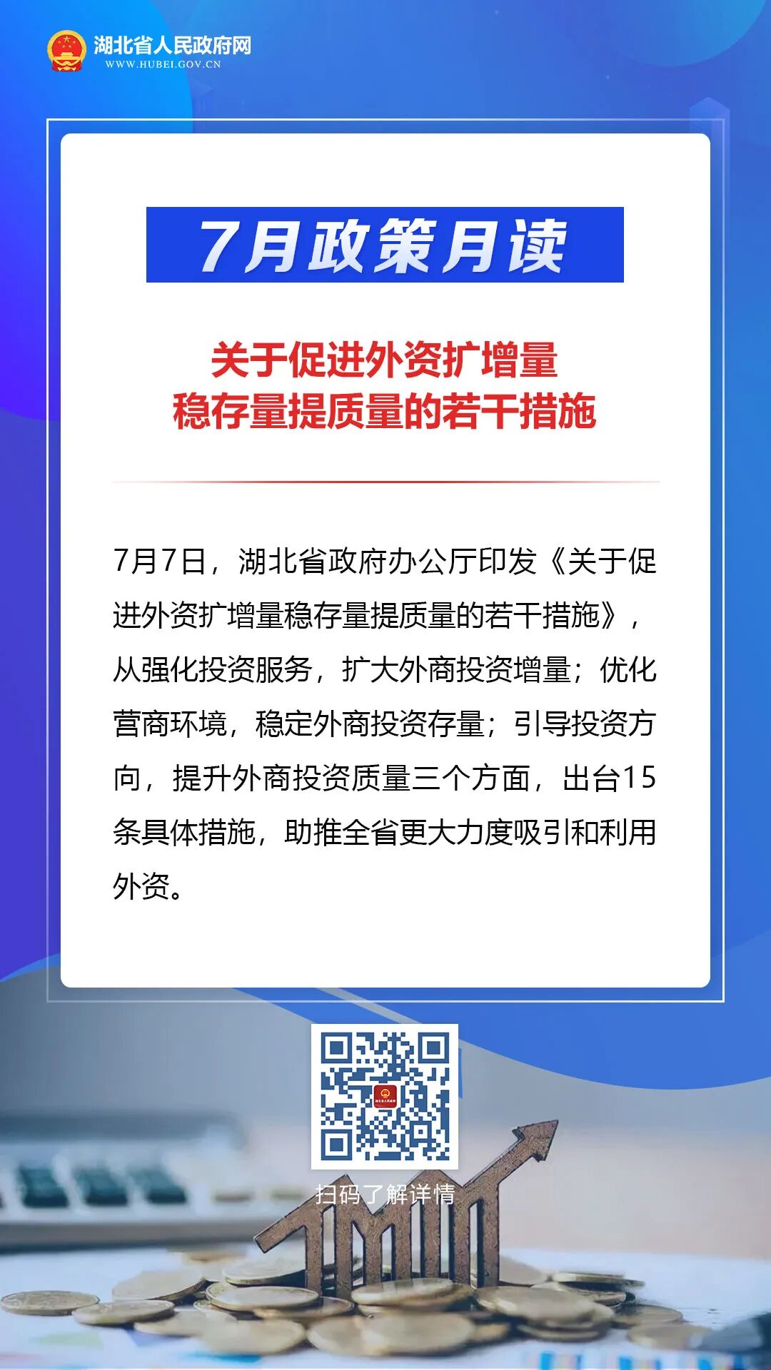 7月,湖北出台多项重要政策,事关促进外资扩增量稳存量提质量、青年就业创业、基本养老金调整等。