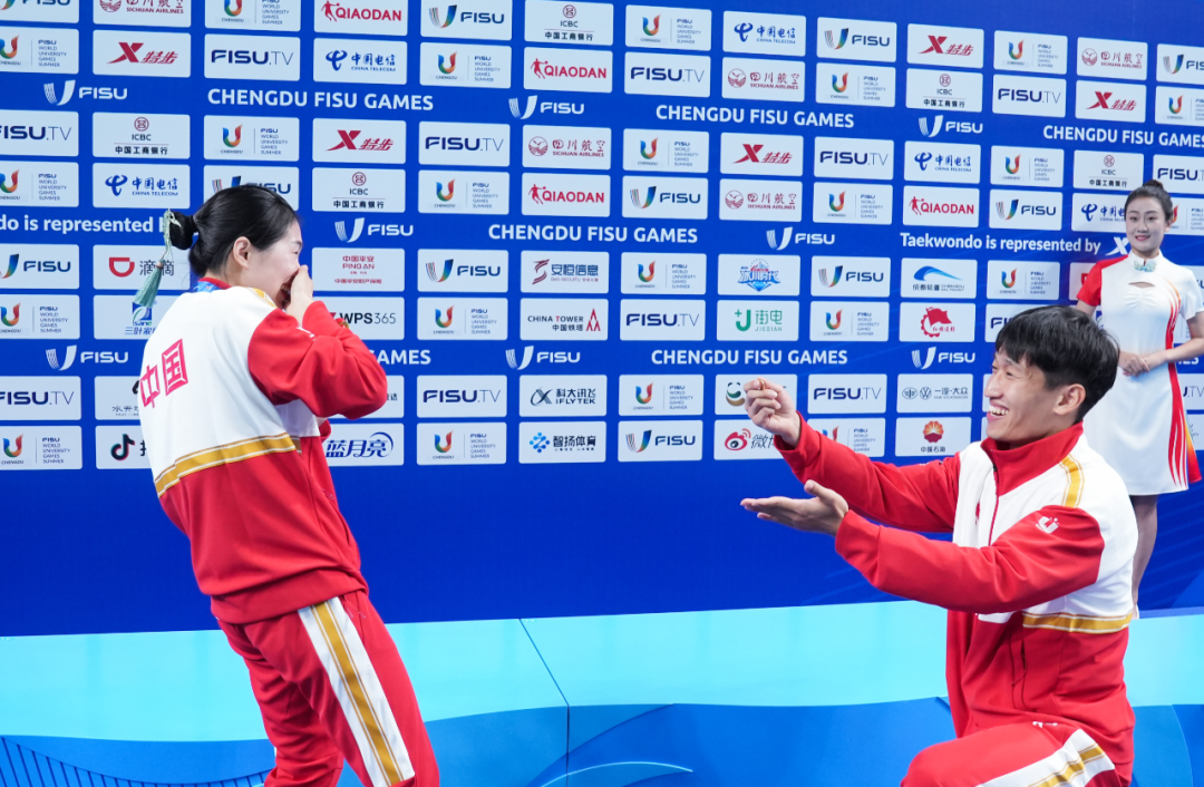 7月30日,胡明达(右)在颁奖台旁向梁婕求婚。新华社记者 江宏景 摄