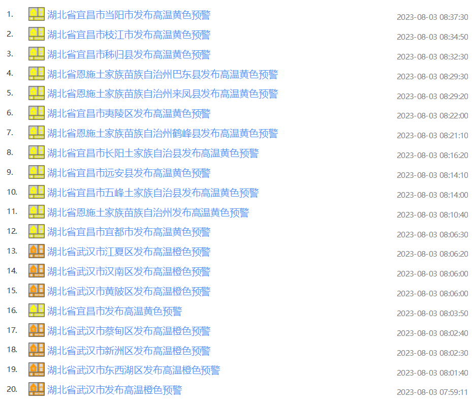 今日(8月3日)8时许湖北多地发布高温预警