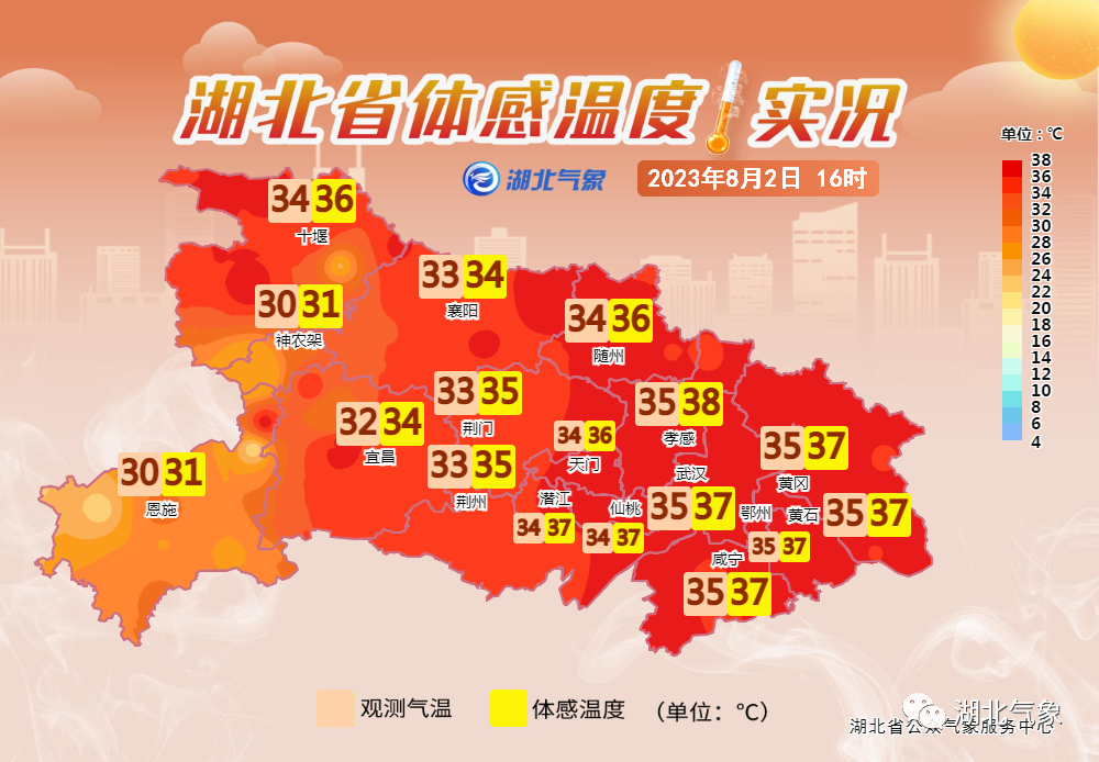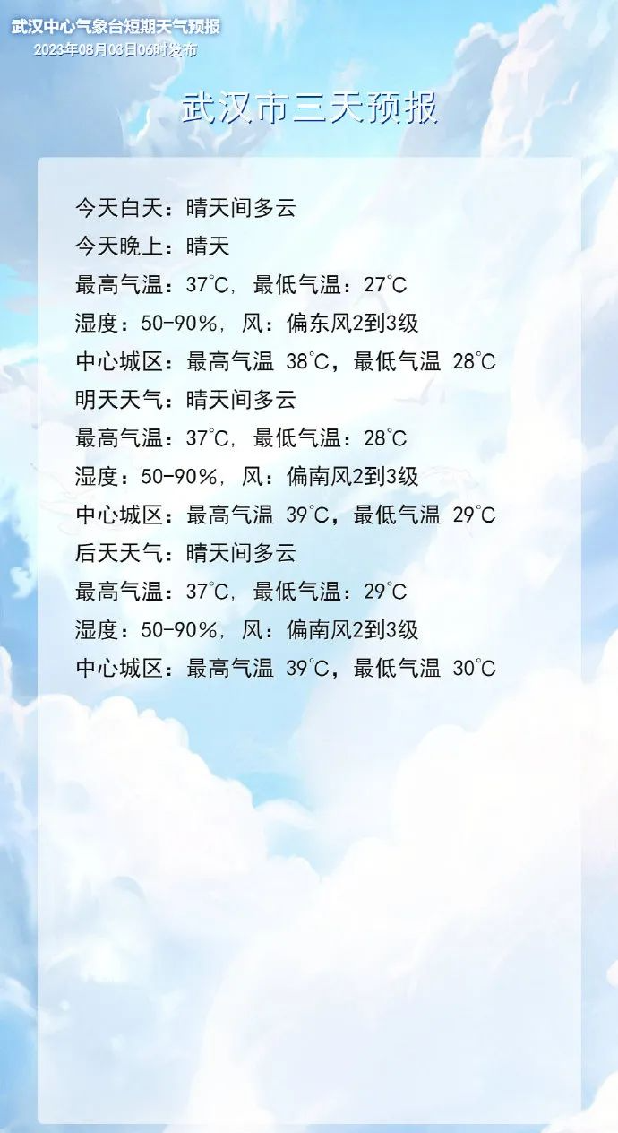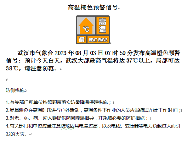 武汉市气象台2023年08月03日07时59分发布高温橙色预警信号:预计今天白天,武汉大部最高气温将达37℃以上,局部可达38℃,请注意防范。