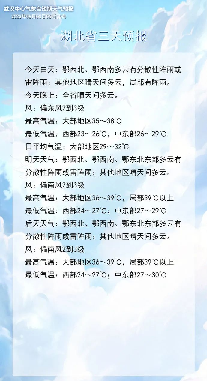 未来三天湖北省以晴热高温天气为主鄂西、江汉平原及鄂东北有分散性阵雨或雷阵雨