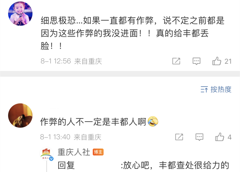 对于网友的质疑,7月17日、18日,“重庆人社”官方微博账号两次在一名质疑网友发布的微博下评论称,“不会让大家失望,很多人正在为此努力工作。”“查处有个过程,静候小编信息,一个也逃不掉。”7月28日,“重庆人社”再次评论称“作弊的人被抓了”。