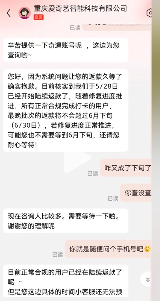 网友@嘉妃石榴分享了她的经历,她以2299元的价格购买了奇遇Dream 8G+128G会员版,购买时显示连续180天运动健身就可以返全款,但是打卡完成后,一直无法联系到客服进行返款,而店铺内所有商品也已经下架。