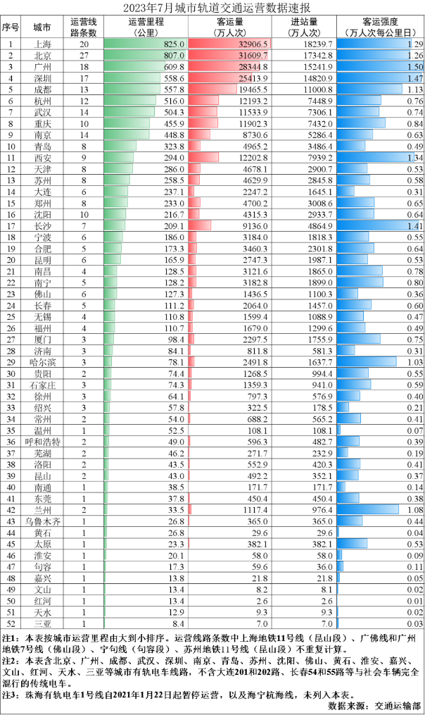 交通运输部消息,7月份我国31个省(自治区、直辖市)和新疆生产建设兵团共有54个城市开通运营城市轨道交通线路296条,完成客运量26.6亿人次,进站量16亿人次。