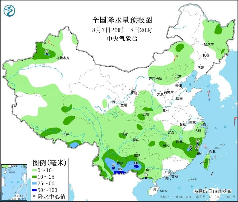 中央气象台预计,7日20时至8日20时,新疆伊犁河谷、西藏东南部、湖南中部、江西中部、浙江南部、福建大部、贵州西南部、云南大部、广西西部和南部沿海等地部分地区有中到大雨,其中,云南中部和南部、广西西部和南部沿海等地部分地区有暴雨。