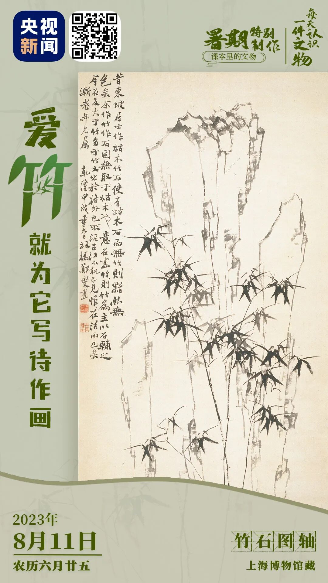 竹的形象备受文人推崇。清代郑板桥(郑燮)堪称竹子狂热爱好者,他诗画结合,用题画诗直抒胸臆。即使是仿前人画竹,他也不拘泥古法,自成⼀体。在《竹石图》中,郑板桥自题“郑板桥画竹 胸无成竹”,既表达了对苏东坡的钦佩之情,又体现了自己的个性风格。