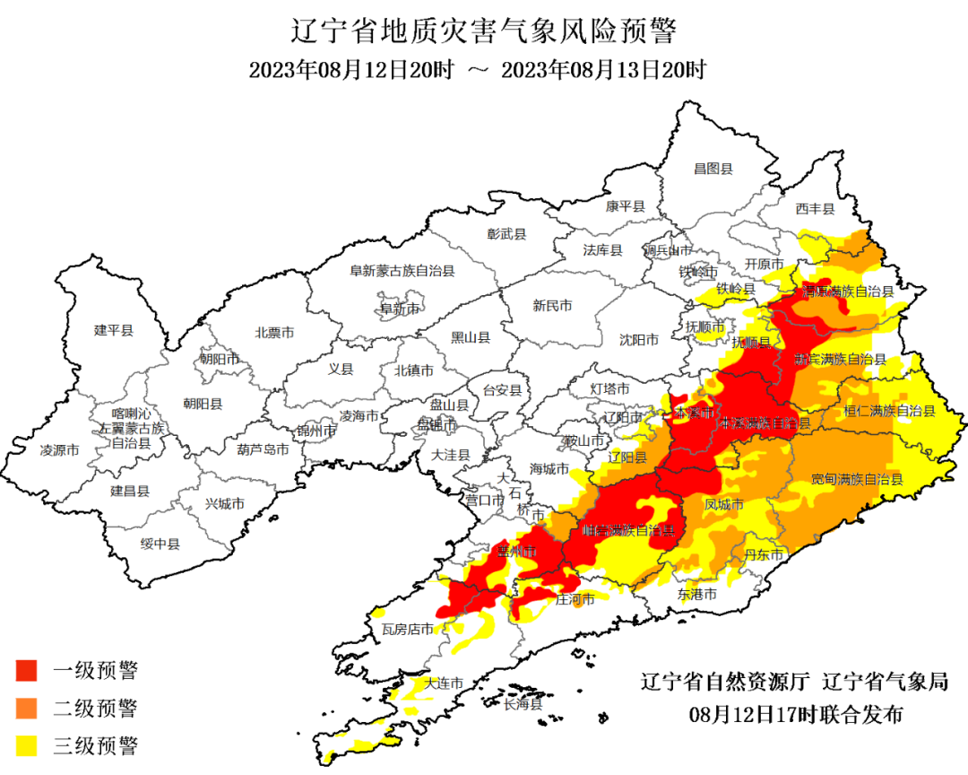 辽宁省12日发布气象风险预警,12日20时至13日20时,大连市、鞍山市、抚顺市、本溪市、丹东市、营口市、辽阳市等部分地区地质灾害气象风险预警等级为一级(红色预警);铁岭市等部分地区地质灾害气象风险预警等级为二级(橙色预警)。