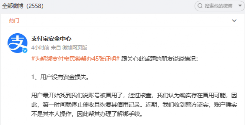 支付宝称,“用户最开始找到我们说账号被冒用了,经过核查,我们认为确实存在冒用可能,因此,第一时间就停止催收且恢复其信用记录。近期,我们收到警方证实,账户确实不是其本人操作,因此帮其办理了解绑手续。”