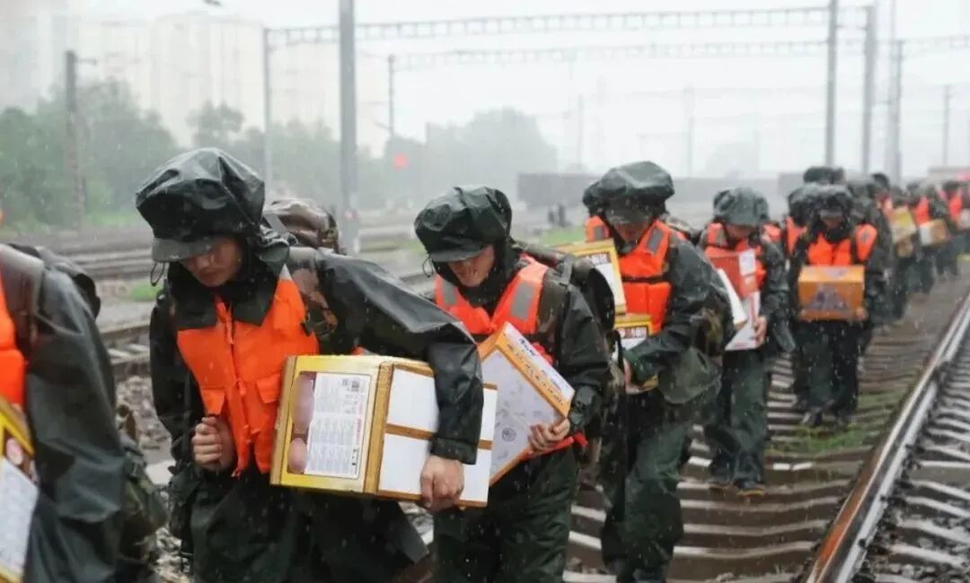 武警北京总队机动第三支队参谋长王峰带领40名突击队员,徒步前往落坡岭车站。他们穿过积水隧道,踩着泥泞淤泥,8月1日下午送来了第一批救援物资。