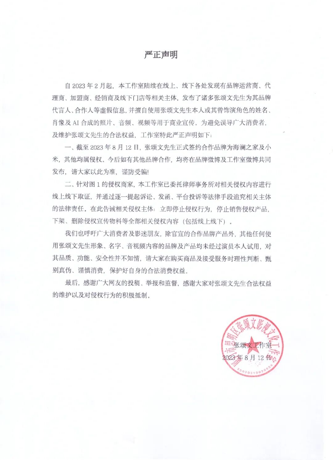 声明中表示,截至2023年8月12日,张颂文正式签约的合作品牌仅海澜之家和小米,其他均属侵权,呼吁消费者及影迷理性判断。