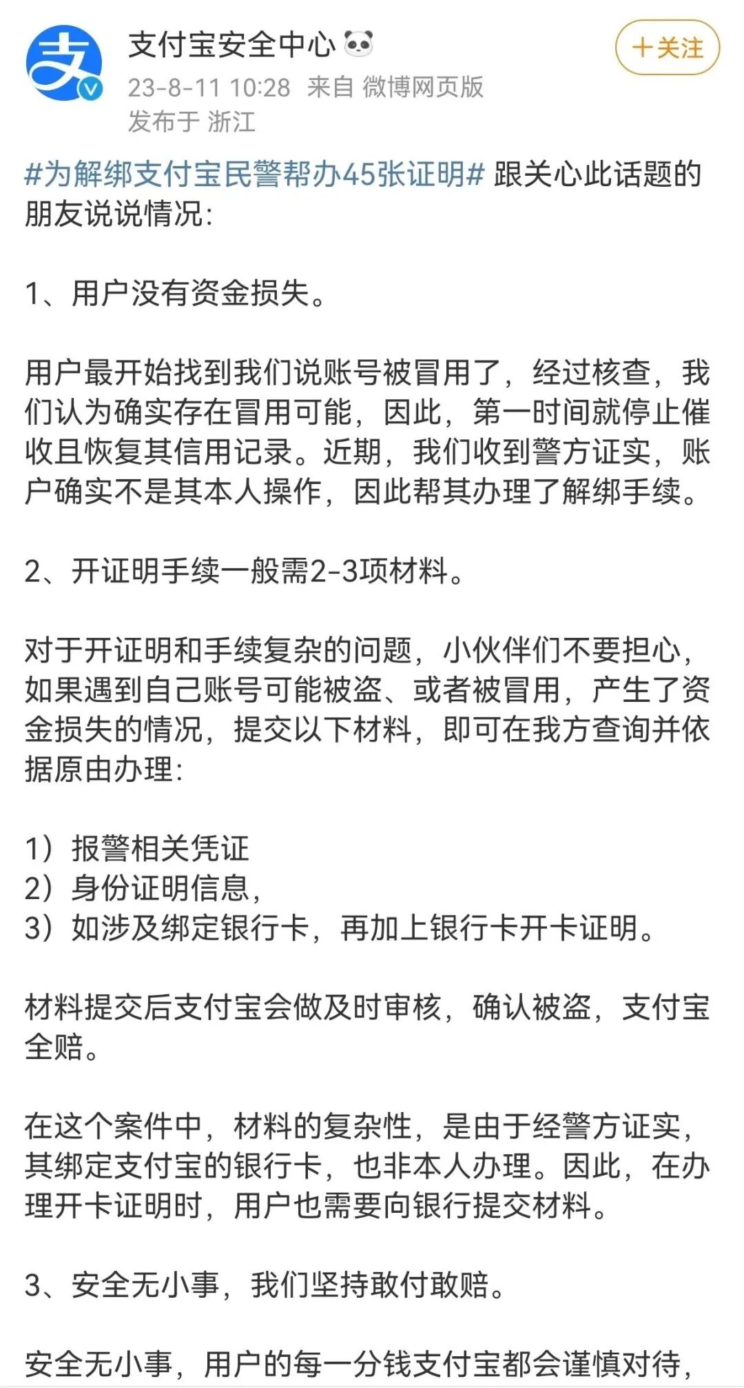 8月11日,@支付宝安全中心 微博发布说明称,经过核查,账号确实存在冒用可能,因此第一时间就停止催收,且恢复其信用记录。