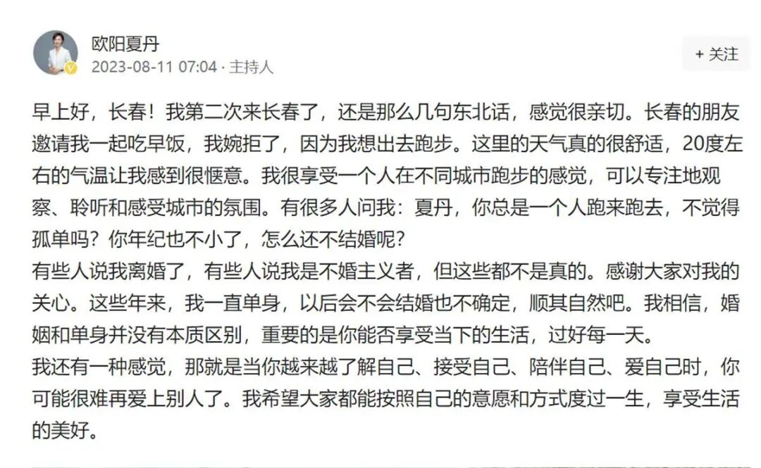 欧阳夏丹在发文中写道:我第二次来长春了。这里的天气真的很舒适,20度左右的气温让我感到很惬意。我很享受一个人在不同城市跑步的感觉,可以专注地观察、聆听和感受城市的氛围。有很多人问我:夏丹,你总是一个人跑来跑去,不觉得孤单吗?你年纪也不小了,怎么还不结婚呢?