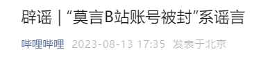今天下午,哔哩哔哩微信公众号发文称,“莫言B站账号被封”系谣言。