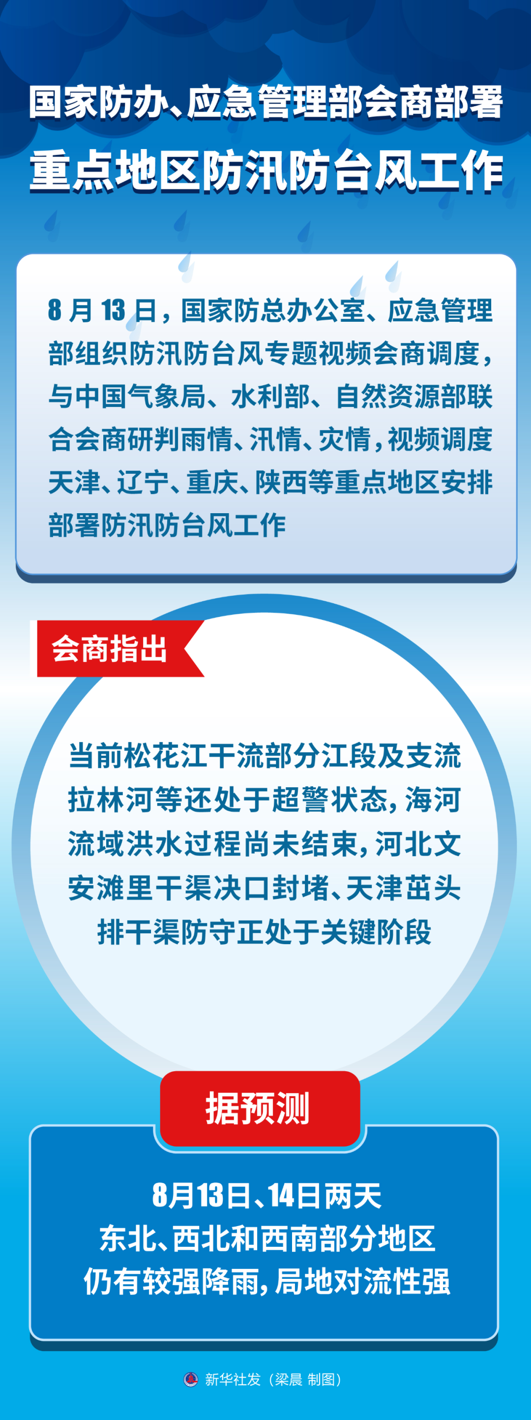 13日,国家防总、应急管理部组织视频会商调度,会商研判雨情、汛情、灾情,视频调度天津、辽宁、重庆、陕西等重点地区安排部署防汛防台风工作。