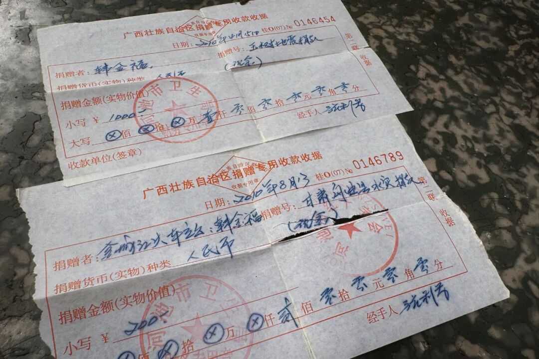 老韩家的旧抽屉里,还留存着几张捐款收据