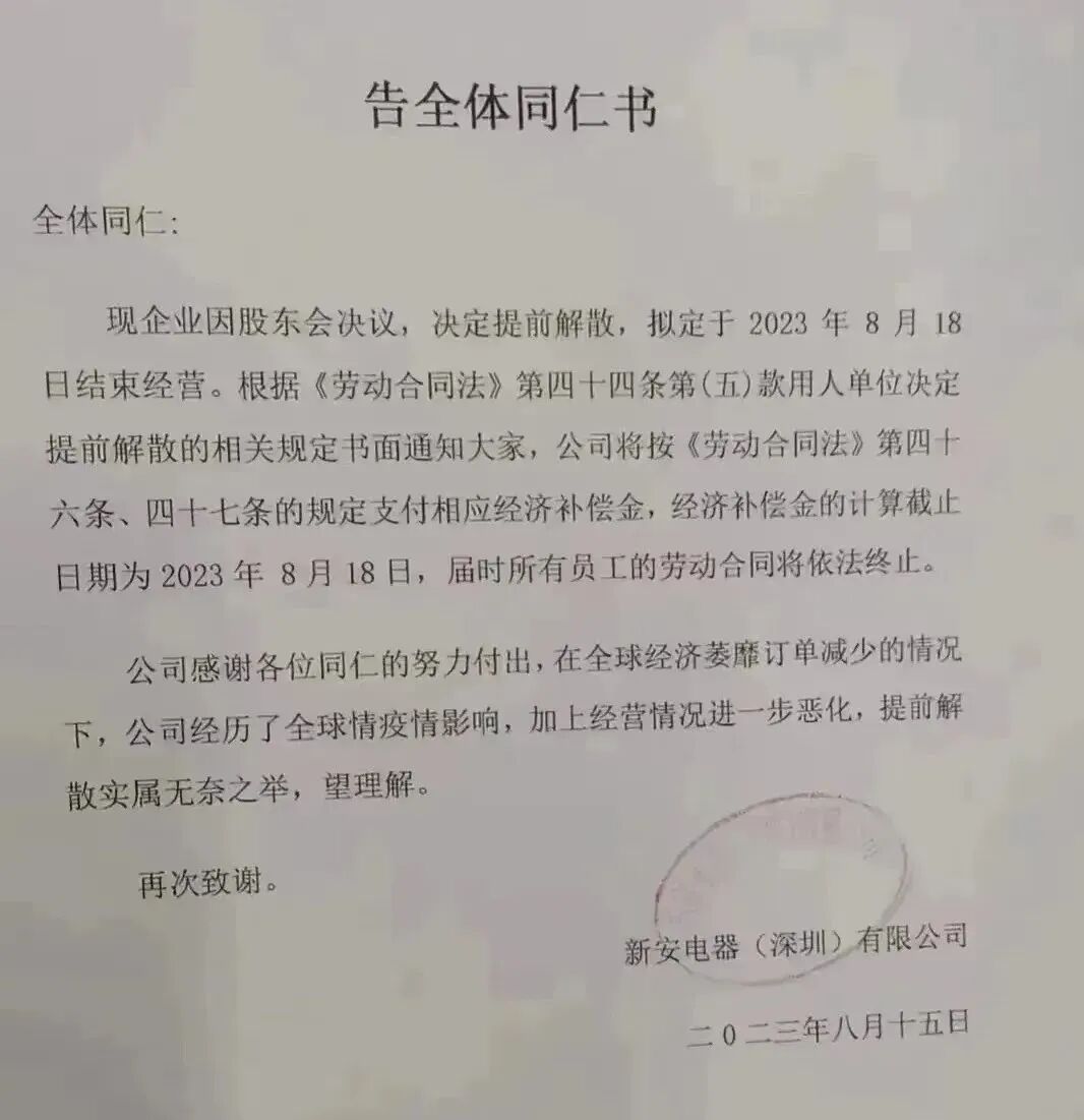 近日,一张新安电器(深圳)公司(以下简称“新安电器”)发布的“告全体同仁书”在网络平台广泛传播。