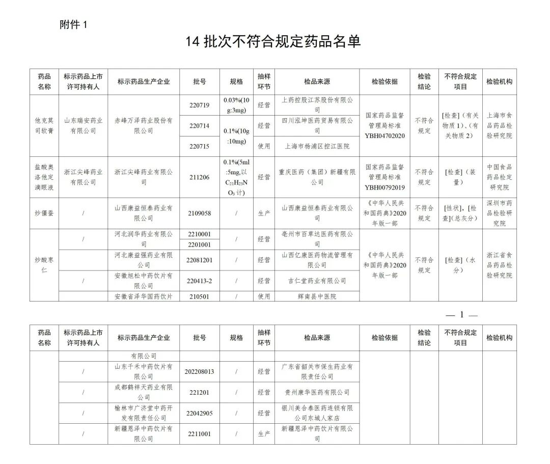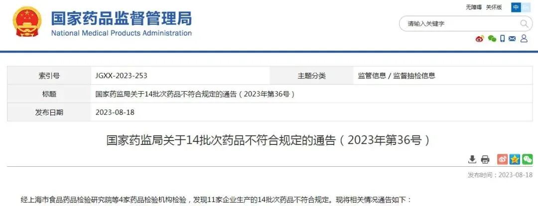 关于14批次药品不符合规定的通告