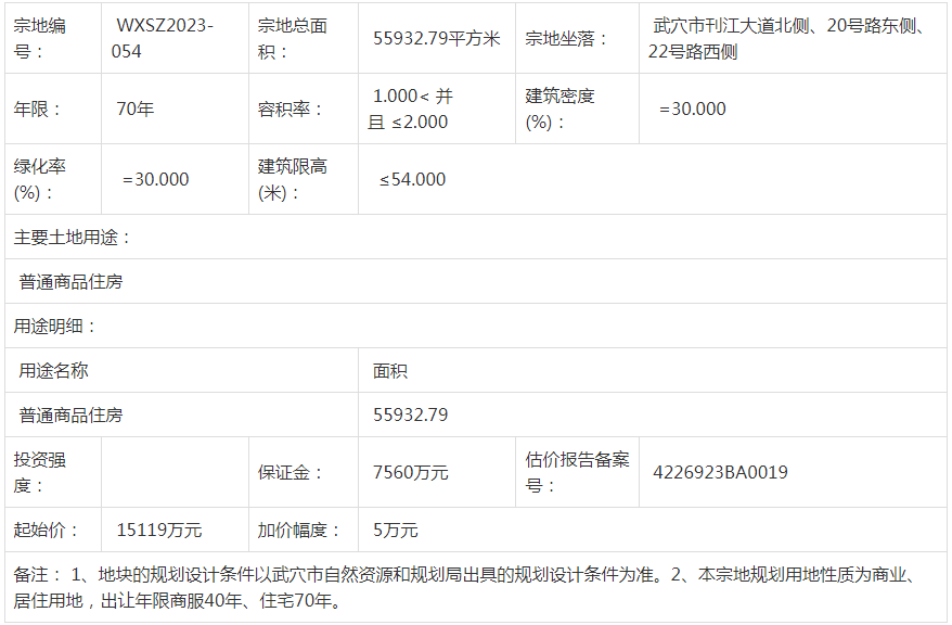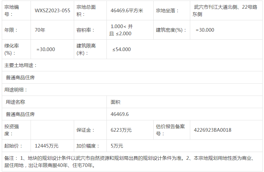宗地编号:WXSZ2023-055宗地坐落: 武穴市刊江大道北侧、22号路东侧经武穴市人民政府批准,武穴市自然资源和规划局决定以 拍卖出让 方式 1(幅) 地块的国有土地使用权。现将有关事项公告如下:一、拍卖出让方式地块的基本情况和规划指标要求: