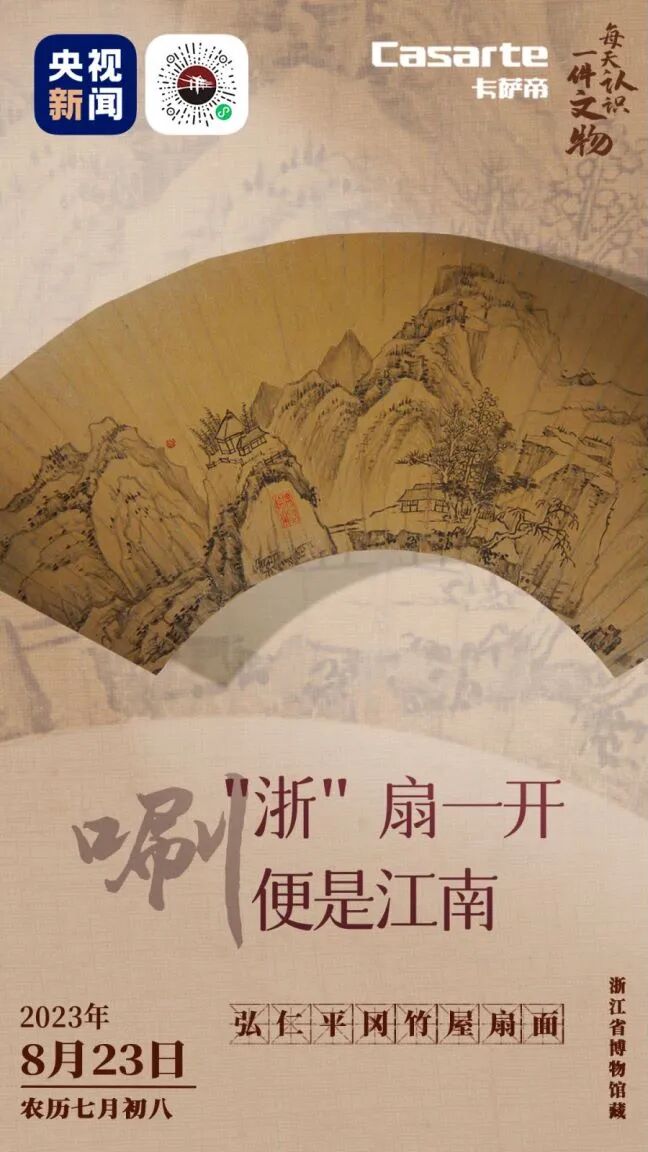 在众多书画扇面中,弘仁平冈竹屋扇面可谓代表之作,近景老树苍劲,竹屋清幽;远处层峦叠嶂,气势宏大。这幅扇面作者是明末清初的著名画僧弘仁,他云游各地,将山川奇秀入画,意境伟峻秀逸。