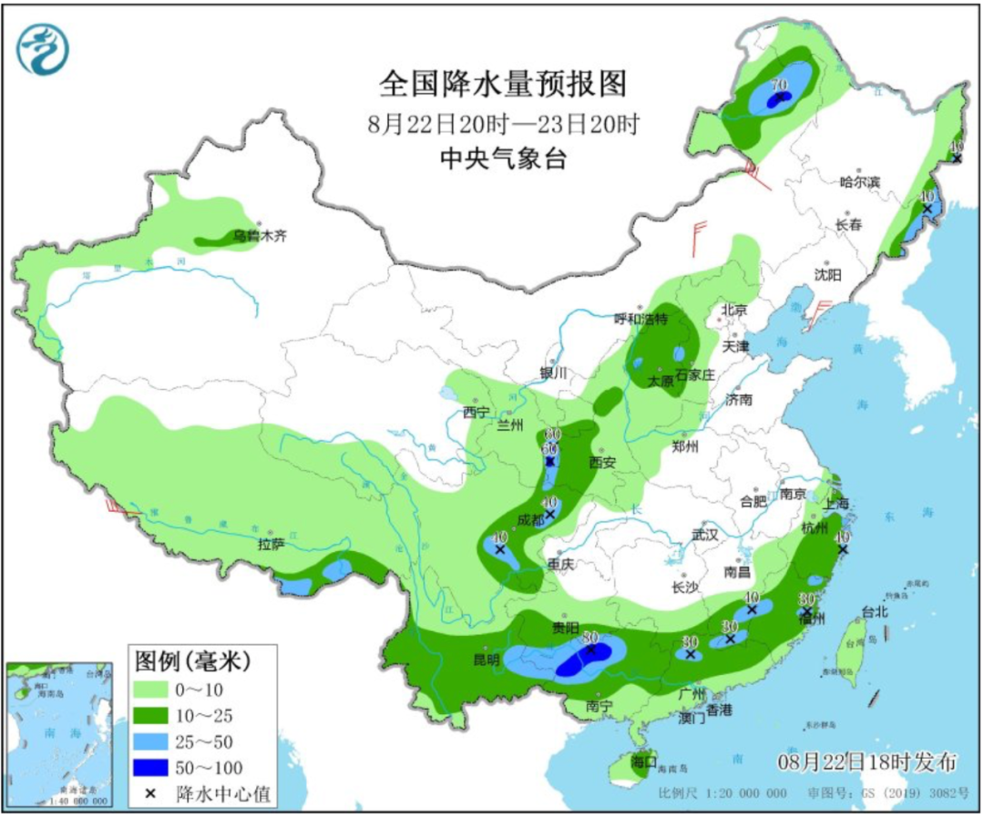 中央气象台预计,22日20时至23日20时,内蒙古东北部、吉林东部、黑龙江东南部、西藏东南部、甘肃东南部、四川盆地北部和西南部、云南东南部、广西西北部、广东北部、江西南部、福建西部和东北部、浙江东部沿海等地部分地区有大雨,其中,内蒙古东北部、甘肃东南部、广西西北部等地局地有暴雨。