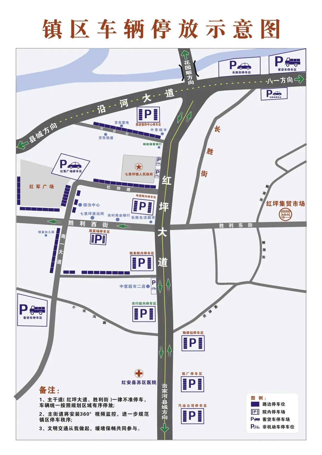 自2023年8月28日起,红安县七里坪镇沿河大道、红坪大道、胜利西街全路段,每日7时至19时禁止机动车辆在路面停放。