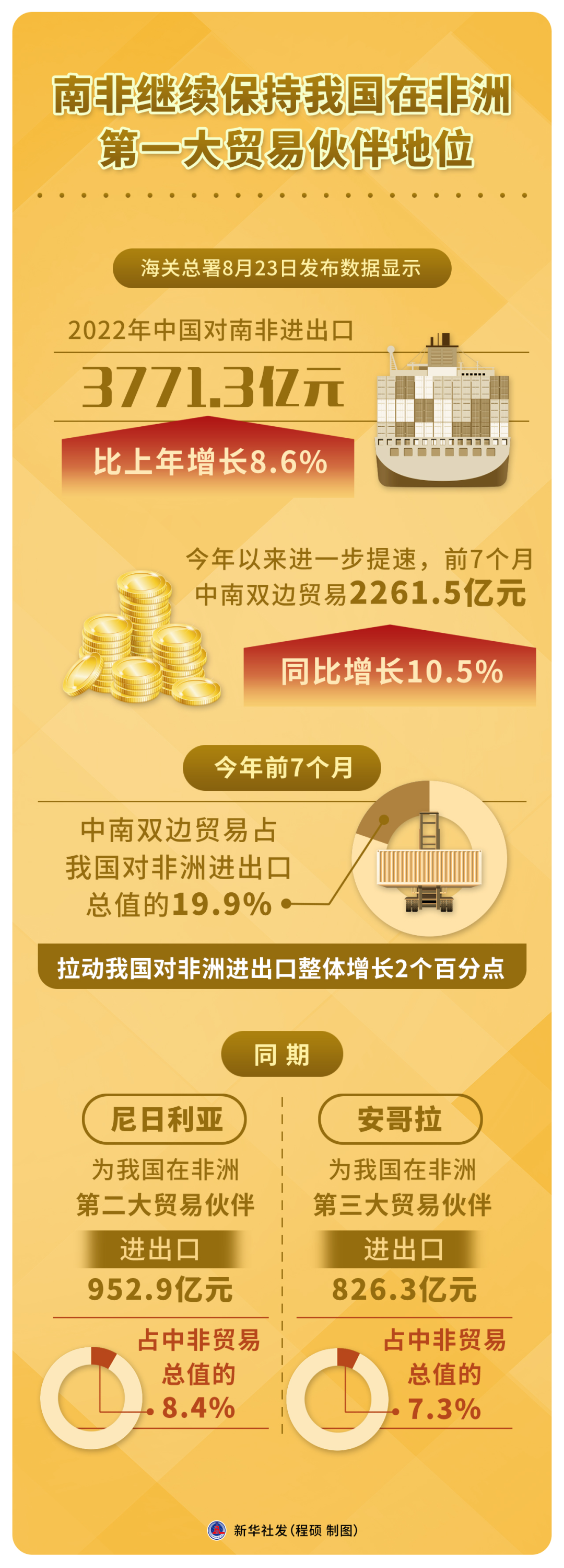 海关总署发布数据显示,2022年中国对南非进出口3771.3亿元,比上年增长8.6%;今年以来进一步提速,前7个月中南双边贸易2261.5亿元,同比增长10.5%,南非继续保持中国在非洲第一大贸易伙伴地位。