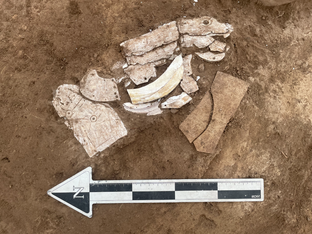 内蒙古赤峰市彩陶坡遗址出土红山文化早期龙形蚌饰。