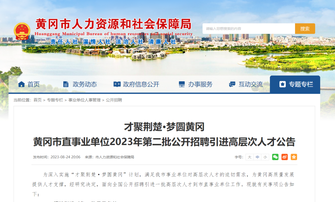 为深入实施“才聚荆楚·梦圆黄冈”计划,满足我市事业单位对高层次人才的迫切需求,为黄冈高质量发展提供人才支撑,经研究决定,面向全国公开招聘引进一批高层次人才到市直事业单位工作。现就有关事项公告如下: