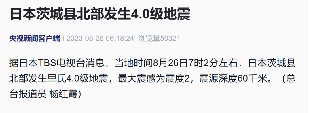据央视新闻援引日本TBS电视台消息,当地时间8月26日7时2分左右,日本茨城县北部发生里氏4.0级地震,最大震感为震度2,震源深度60千米。
