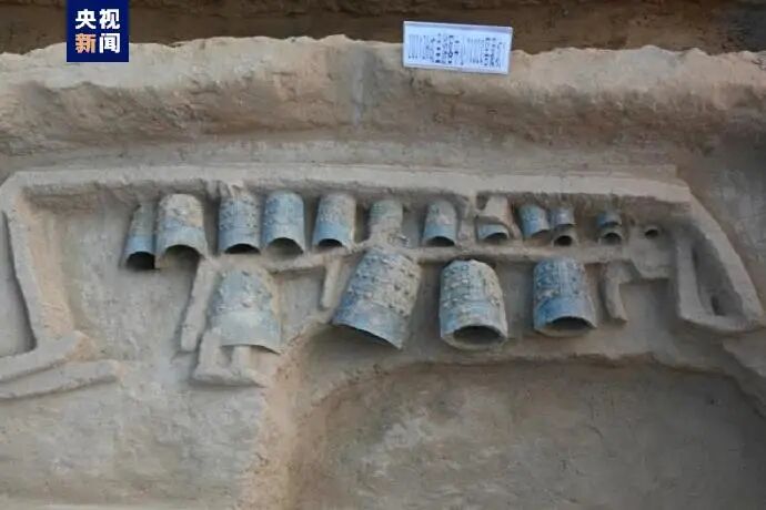 近日,考古人员在河南新郑黄帝故里遗址发现一座编钟祭祀坑,坑内出土有三排钟架,共24个编钟。