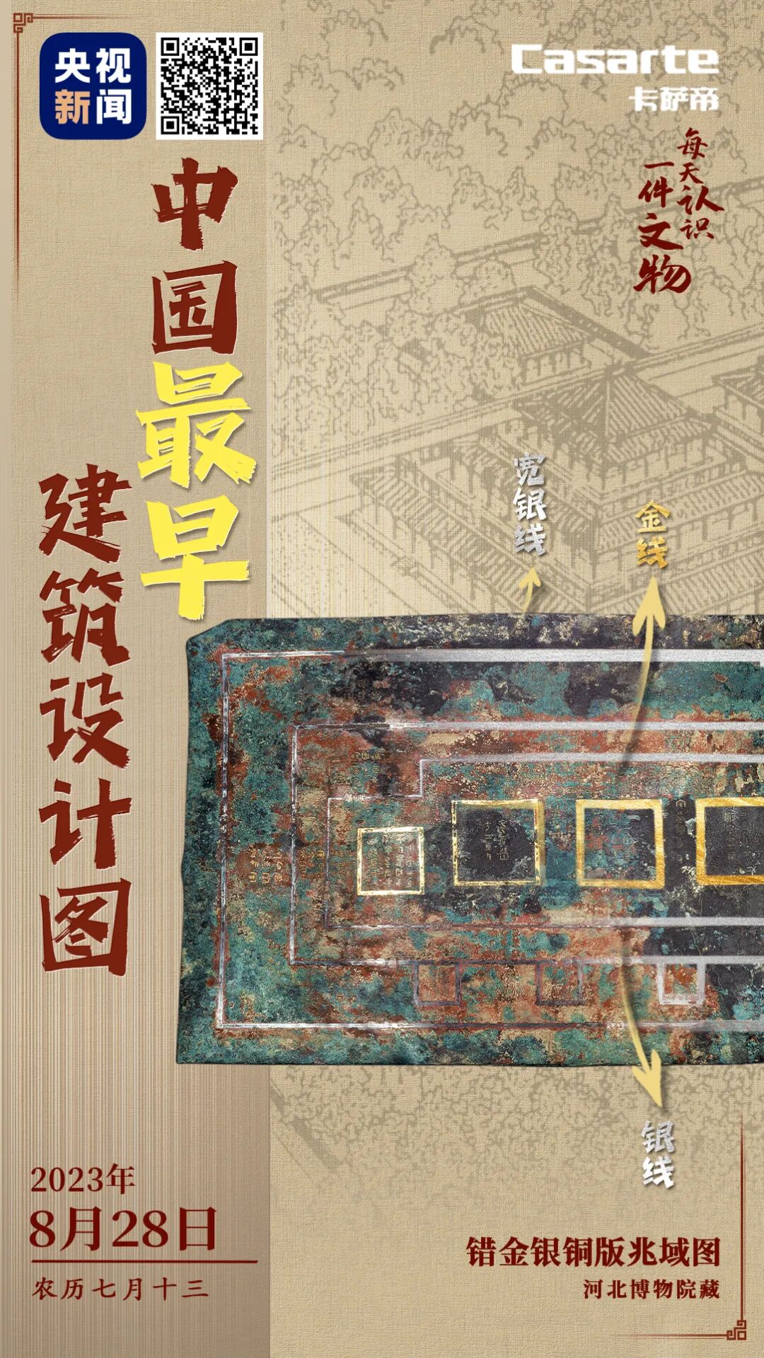 央视新闻联合全国博物馆推出文博科普产品《文博日历》,每天带您认识一件文物。收藏在河北博物院的错金银铜版兆域图,是我国已经发现最早的建筑平面规划图。它长96厘米、重32.1公斤,用金银镶嵌勾勒出不同区域。在两千多年的时光里,它静静沉淀,诉说着那个时代的精湛技艺与兴衰荣枯。