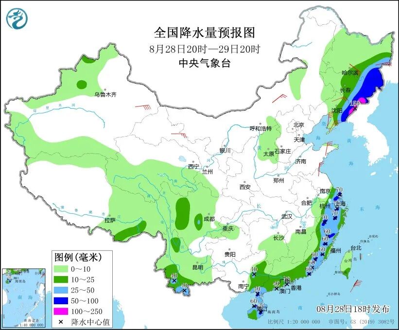 中央气象台28日18时继续发布暴雨蓝色预警,预计28日20时至29日20时,辽宁东部、吉林东部、黑龙江东南部、江苏东南部、上海、浙江、福建中东部、广东东部和南部沿海、广西东南部沿海、海南岛中东部和北部、云南西南部等地部分地区有大到暴雨,其中,辽宁东北部、吉林东南部等地局地有大暴雨。上述部分地区伴有短时强降水,局地有雷暴大风或冰雹等强对流天气。