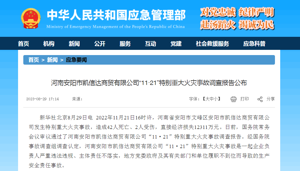新华社北京8月29日消息,2022年11月21日16时许,河南省安阳市文峰区安阳市凯信达商贸有限公司发生特别重大火灾事故,造成42人死亡、2人受伤,直接经济损失12311万元。