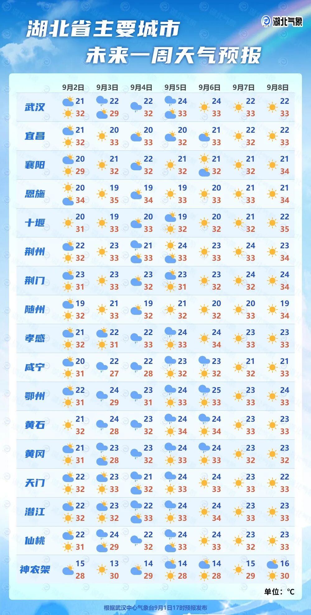 “秋老虎”横行,注意防暑降温依据气候规律, 9月份湖北省常有“秋老虎”出没,天气依然较为炎热,学生也需要注意防暑降温。尤其是在高温烈日之下开展体育课或军事训练,更要注意。当最高气温升到33℃以上时,户外运动就要尽量避开11点-15点的高温时段进行,军训时最好配备医护人员在现场。同时,大量流汗后要注意补充水分和电解质。
