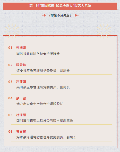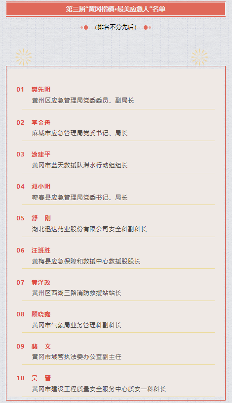 第三届“黄冈楷模·最美应急人”名单出炉。经组织推荐、民主择优、网上公示等环节,决定授予樊先明等10名同志第三届“黄冈楷模·最美应急人”荣誉称号;授予阮云峰等6名同志第三届“黄冈楷模·最美应急人”提名人荣誉称号。