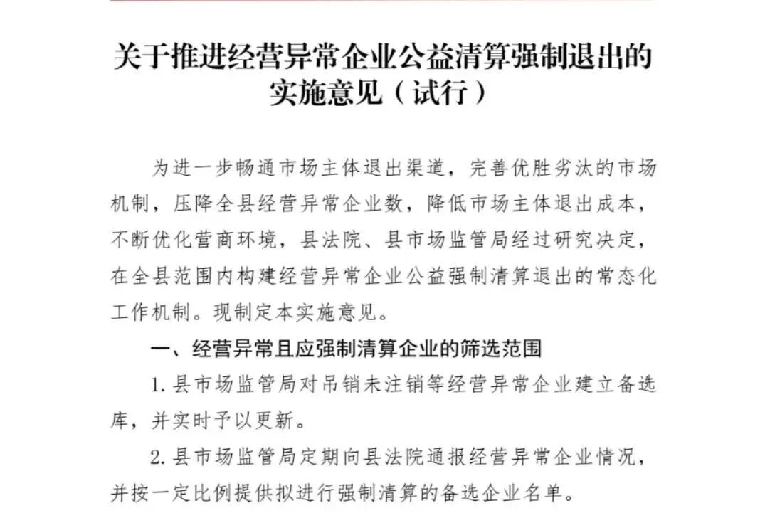 为进一步畅通市场主体退出渠道,规范市场主体退出秩序,降低市场主体退出成本,助力优化法治化营商环境,近日,红安县人民法院联合红安县市场监督管理局共同出台《关于推进经营异常企业公益清算强制退出的实施意见(试行)》(以下简称《意见》),构建经营异常企业公益清算强制退出的常态化机制。