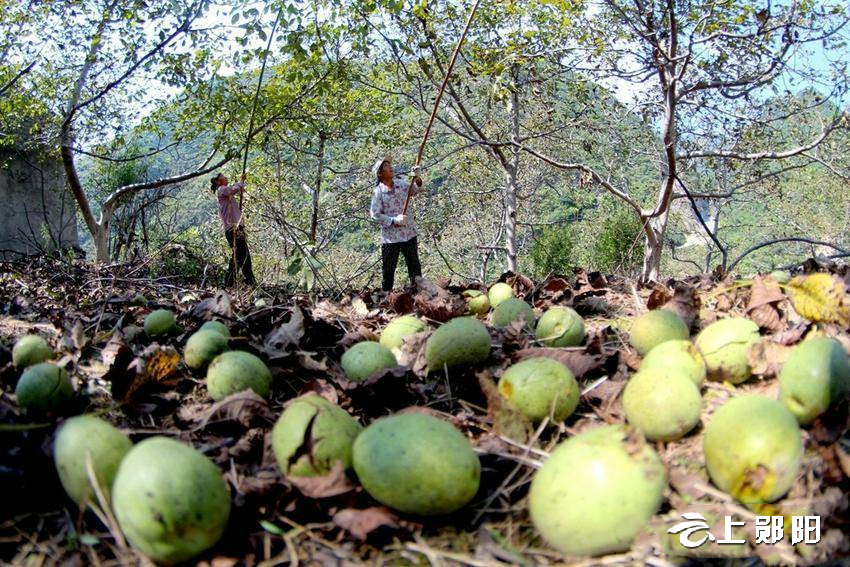 9月3日,在谭家湾镇青山村,村民忙着用竹竿打核桃,并将打下的核桃分拣打包。由于今年雨水充沛,加上管护到位,青山村260亩核桃基地迎来大丰收。