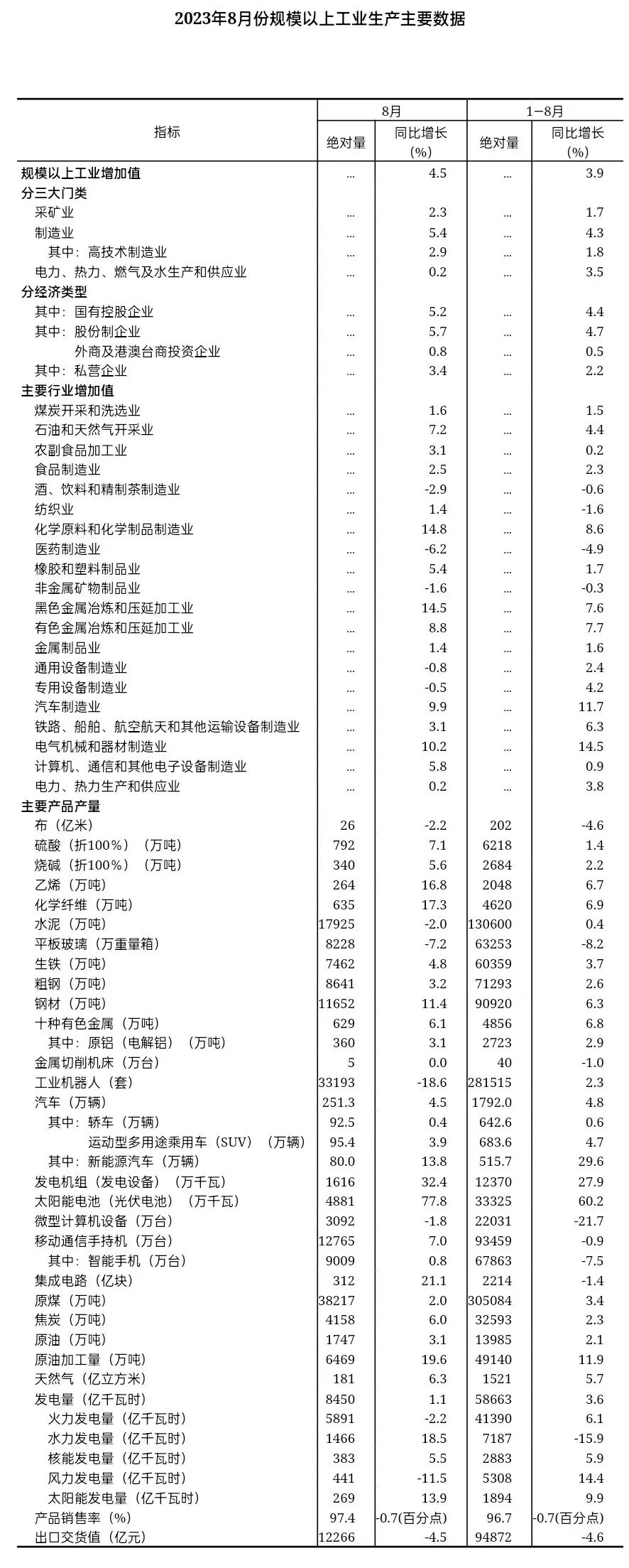 分经济类型看,8月份,国有控股企业增加值同比增长5.2%;股份制企业增长5.7%,外商及港澳台商投资企业增长0.8%;私营企业增长3.4%。分行业看,8月份,41个大类行业中有23个行业增加值保持同比增长。其中煤炭开采和洗选业增长1.6%,石油和天然气开采业增长7.2%,农副食品加工业增长3.1%,酒、饮料和精制茶制造业下降2.9%,纺织业增长1.4%,化学原料和化学制品制造业增长14.8%,非金属矿物制品业下降1.6%,黑色金属冶炼和压延加工业增长14.5%,有色金属冶炼和压延加工业增长8.8%,通用设备制造业下降0.8%,专用设备制造业下降0.5%,汽车制造业增长9.9%,铁路、船舶、航空航天和其他运输设备制造业增长3.1%,电气机械和器材制造业增长10.2%,计算机、通信和其他电子设备制造业增长5.8%,电力、热力生产和供应业增长0.2%。分产品看,8月份,620种产品中有356种产品产量同比增长。钢材11652万吨,同比增长11.4%;水泥17925万吨,下降2.0%;十种有色金属629万吨,增长6.1%;乙烯264万吨,增长16.8%;汽车251.3万辆,增长4.5%,其中新能源汽车80.0万辆,增长13.8%;发电量8450亿千瓦时,增长1.1%;原油加工量6469万吨,增长19.6%。8月份,工业企业产品销售率为97.4%,同比下降0.7个百分点;工业企业实现出口交货值12266亿元,同比名义下降4.5%。