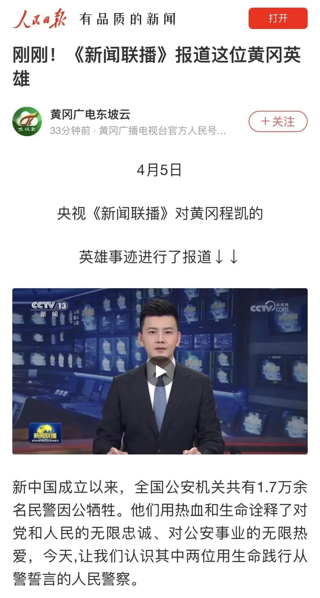 今天多家央媒对黄冈民警程凯和黄冈杏花村进行报道
