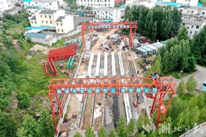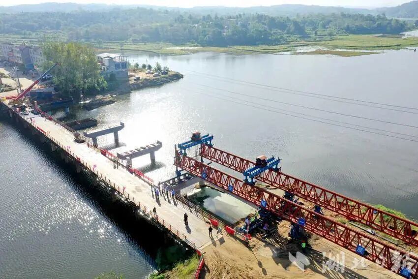 9月15日上午8点,在麻城市顺河集大桥项目施工现场,数条钢丝绳牵引着架桥机缓缓移动,一块长20米、重30吨的梁板稳稳安装在预定位置,顺河集大桥首片预制T梁架设成功标志着该项目进入桥梁上部构造施工阶段,为实现年底通车目标迈出了坚实的一步。