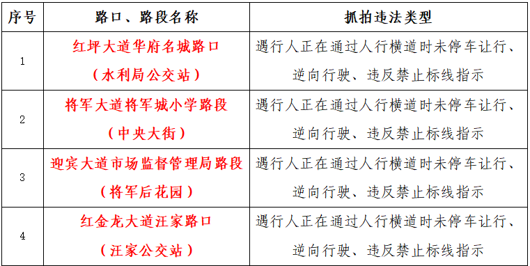 为预防和减少道路交通事故,保障道路交通安全畅通有序,根据《中华人民共和国道路交通安全法》等相关法律法规规定,自2023年10月7日起,在红安县部分路口、路段启用新增电子警察交通违法抓拍系统,对遇行人正在通过人行横道时未停车让行、逆向行驶、违反禁止标线指示等交通违法行为进行自动抓拍并依法处理。现将辖区新增电子警察抓拍点位公示如下: