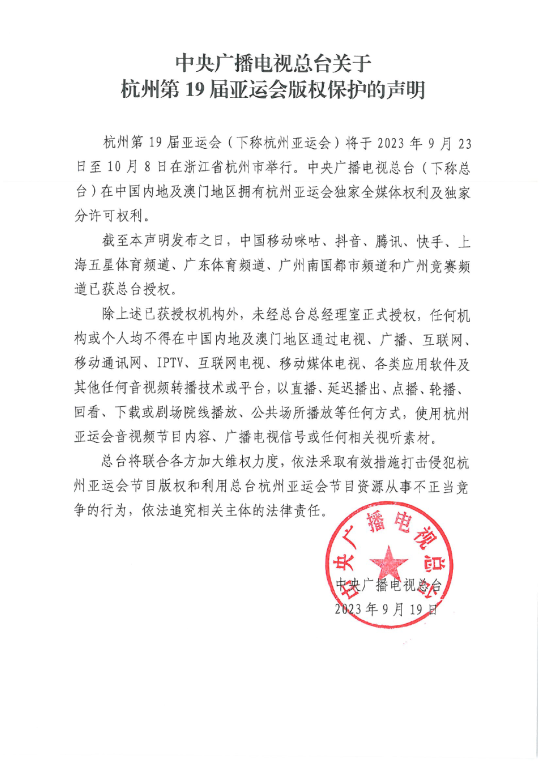 央视新闻,赞1万日前,中央广播电视总台发布声明,明确总台在中国内地及澳门地区拥有杭州亚运会独家全媒体权利及独家分许可权利,总台将联合各方加大维权力度。滑动查看详情↓