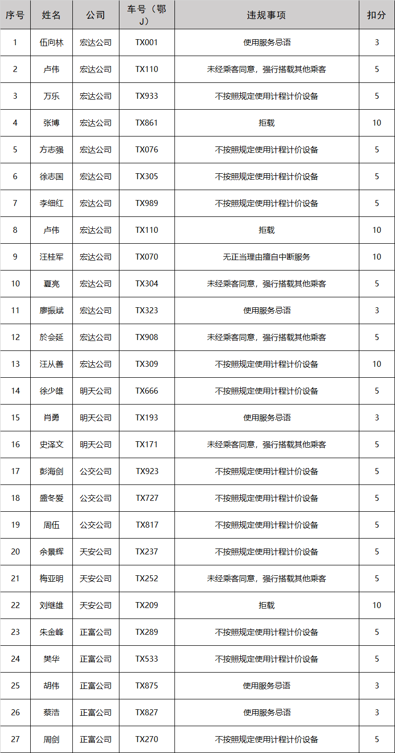 对上黑榜驾驶员提出批评,希望他们规范经营,文明服务,进一步提升服务水平,加油!