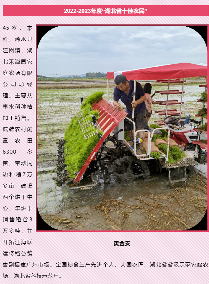“中国农民丰收节”湖北·公安主会场揭晓了2022-2023年度“湖北省十佳农民”名单。其中,来自浠水县的黄金安摘此殊荣。