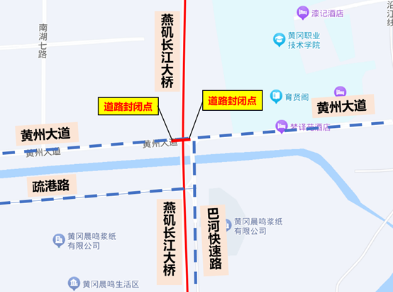 三、绕行路线黄州大道与巴河快速路接口封闭,车辆及行人需通过巴河快速路(职院桥)、疏港路绕行,其余区域行车路线不受影响