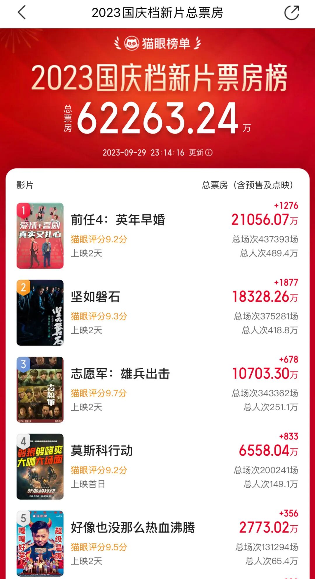 截至9月29日晚23时14分,国庆档电影总票房(含预售)已达6.2亿。其中田羽生导演的《前任4:英年早婚》以2.1亿暂时领先,张艺谋导演的《坚如磐石》以1.8亿紧随其后,陈凯歌导演的《志愿军:雄兵出击》票房也突破1亿,排名第三。