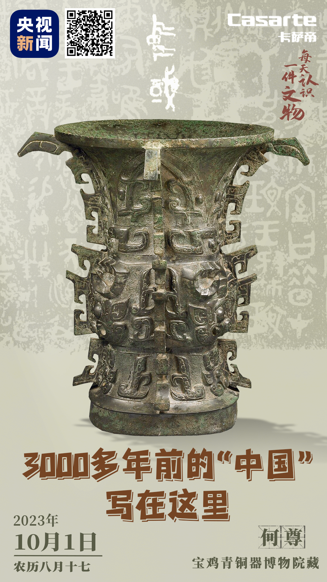 今天是国庆节,一起来认识这件3000多年前,西周早期铸造的一件青铜礼器何尊。何尊上的铭文“宅兹中国”,是“中国”第一次作为一个词组在历史上出现。