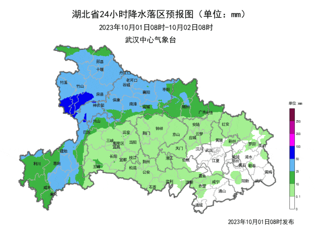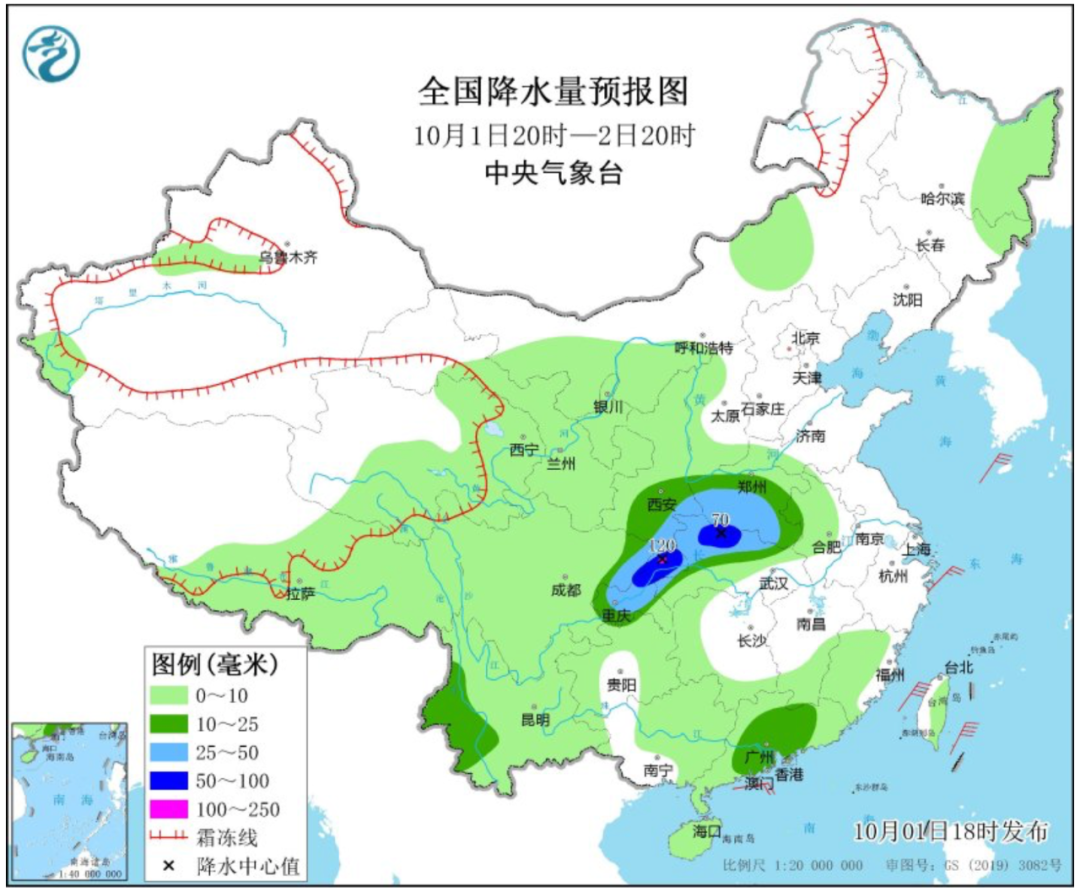 中央气象台预计,10月1日20时至2日20时,陕西南部、四川东部、重庆、湖北西部、河南南部以及云南西南部、广东中南部等地部分地区有中到大雨,其中,河南西南部、湖北北部、重庆北部等地部分地区有暴雨或大暴雨。
